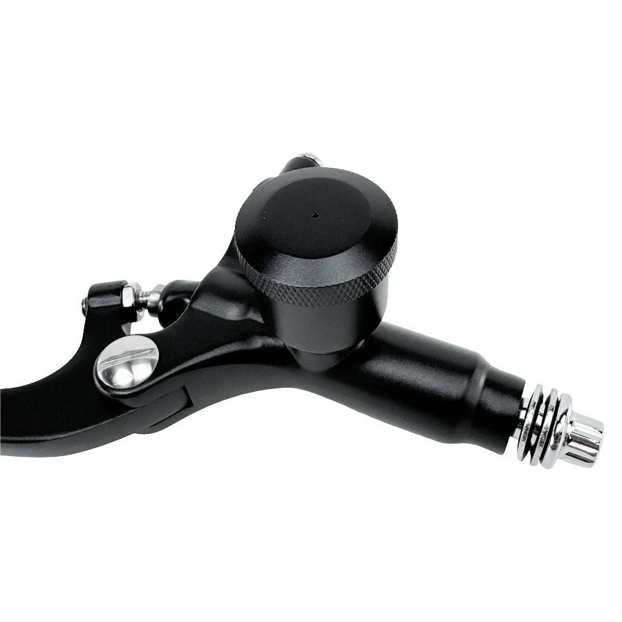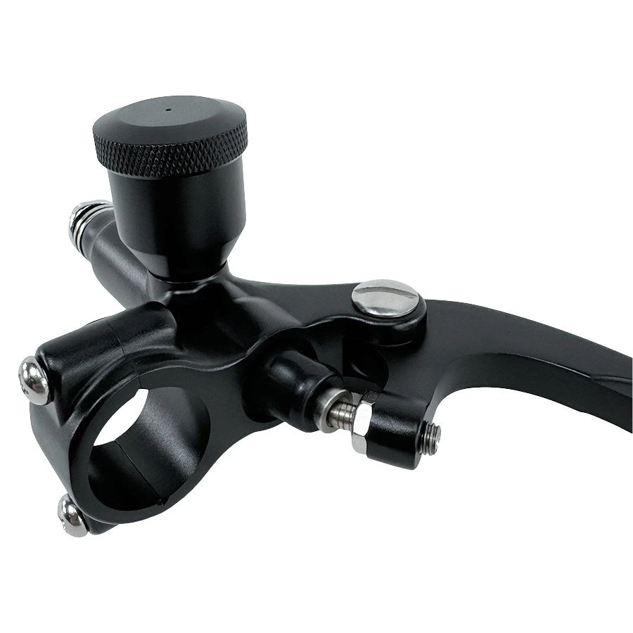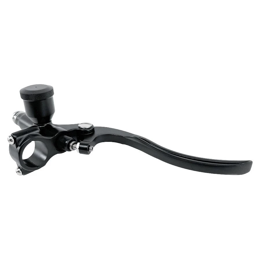 Black master cylinder and clutch for 1″ motorcycle handlebars. Fits Harley ‘ring’ type clutch cable found on EVO Sportsters and other models. Also includes an end for a barrel style clutch cable fitting. Some models may require clutch cable modification. 9/16″ (14mm) bore for most single caliper/disc applications. Master cylinder uses DOT 5 Brake Fluid.