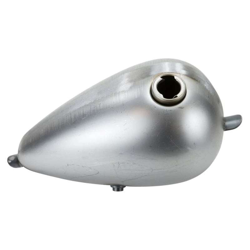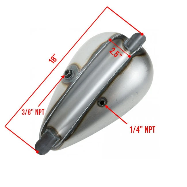Universal mounting tabs make this tank fit virtually any custom chopper or bobber. Dimensions: Tank Body 15.75″, Tip to Tip of Tabs 18″, Tunnel Width 2.5″, Overall Height 8.5″. Tank uses CAM LOCK gas cap and either 3/8″ NPT or 1/4″ NPT male petcock. If using on a bike with 2 carburetors and 2 fuel lines, we recommend use of the 3/8″ NPT petcock with a brass tee fitting in the fuel line to feed both carbs.