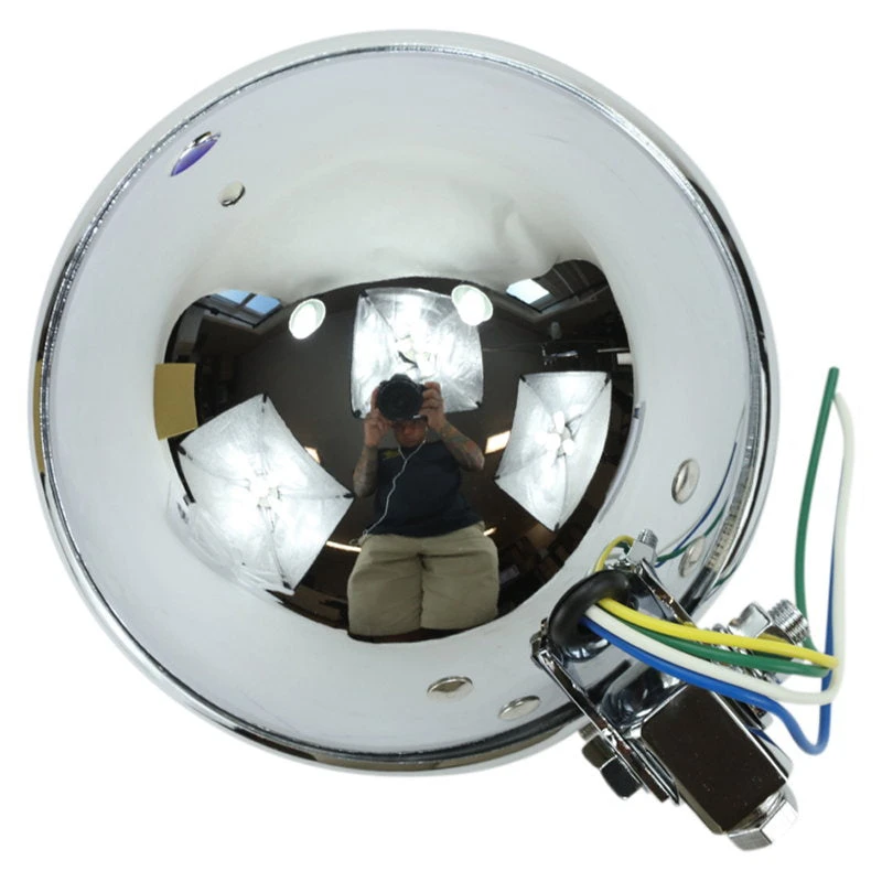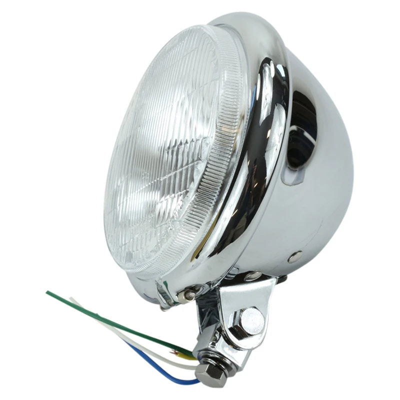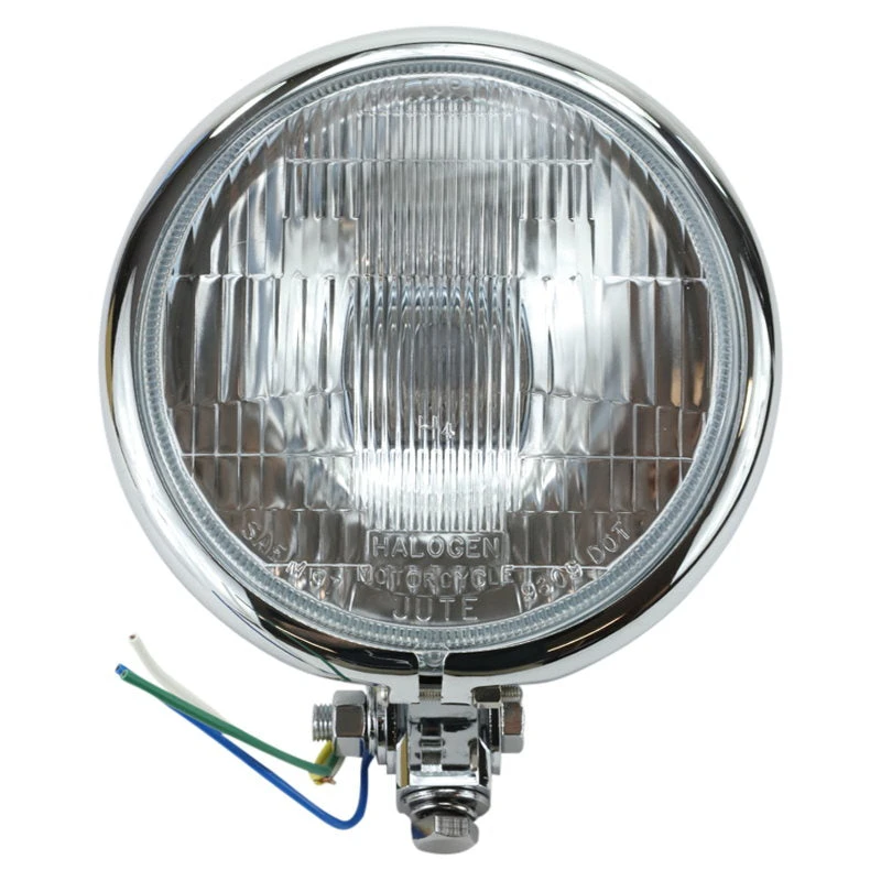 5.75″ diameter custom Halogen motorcycle headlight. Classic styling looks great on choppers and bobbers! Light includes blue high beam indicator light on top of housing. Wire colors are Blue (high beam 12V+), White (low beam 12V+), Yellow (high beam indicator 12V+), and Green (ground).