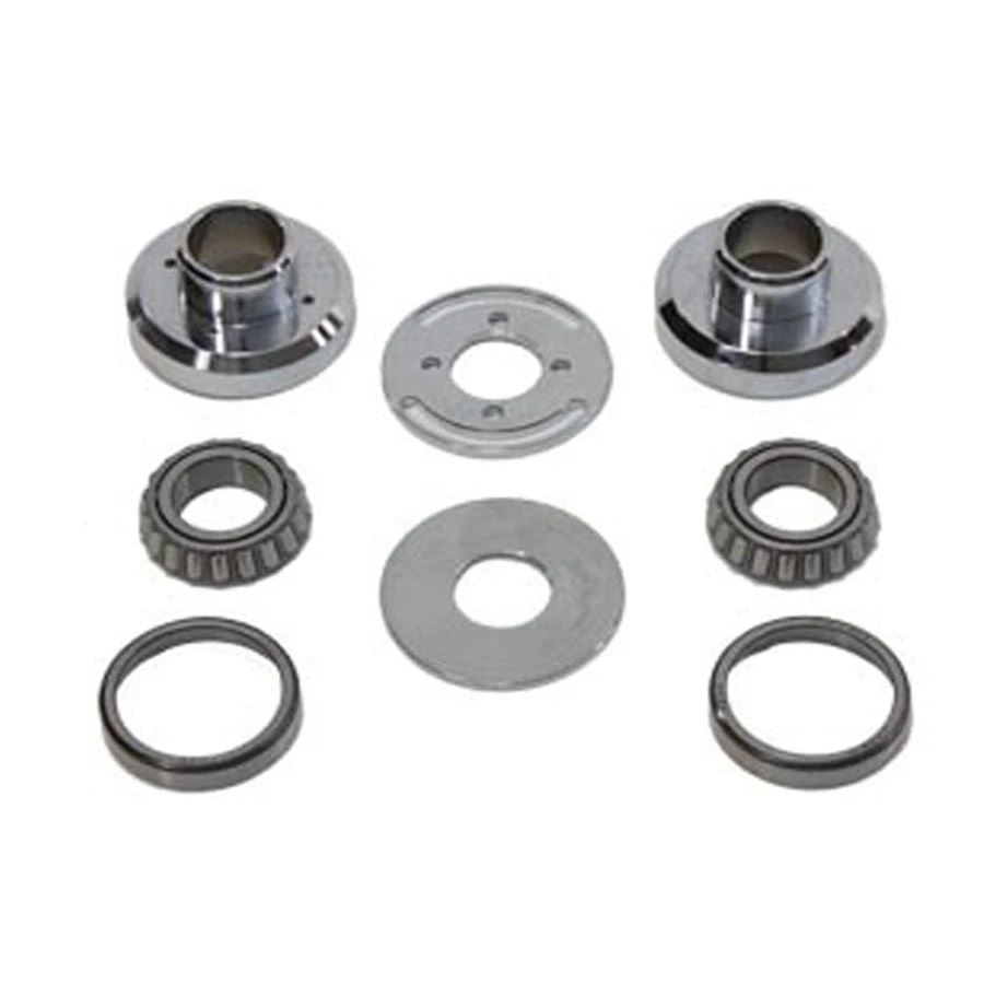 Neck cup kit includes races, bearings, neck cups, and pieces for entire installation on Big Twins and custom frames which accept press in neck cups.