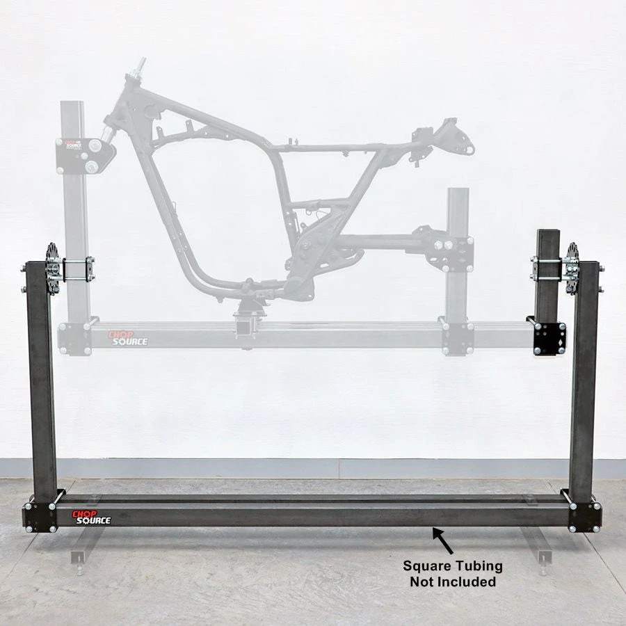 Get your motorcycle frame jig off the table or lift and make it rotate for easier welding with a Chop Source Frame Jig Rotisserie Stand. The brackets lock in 16 positions and can be moved along their uprights to balance the jig and frame. You need to supply 22’2″ of 2″x3″ or 2″x2″ tubing (1/8″ wall) for the the stand (move the feet from your table-top jig to the stand). See the assembly instructions for more details. Structural tubing can be found at your local metal supply shop or welding/fabricating shop.