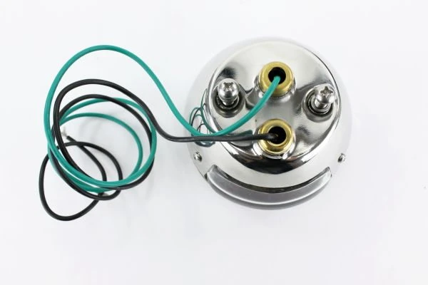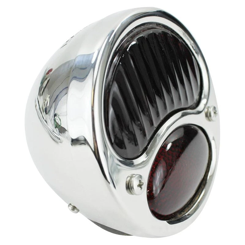 TC Bros. Polished stainless steel 12V Ford Duolamp reproduction tail light with red glass lens. Light features both a brake/running light as well as a License plate light to illuminate your plate at night. The two wire hook-up for the brake and tail lights mean this light is self grounding through its housing. The black wire is the 12V positive running light hookup. The green wire is the 12V positive brake light hookup. Light features standard automotive style bulbs (#1156 for Brake Light, and #67 miniature for Running Light). Replacement bulbs are easily sourced from local autoparts stores should you ever require. These lights measure 3 3/4″ in diameter, 2 1/4″ deep. The mounting studs are 1 3/4″ center to center. Great light for your old school bobber or chopper! Note: For best results on high-vibration applications, isolate the tail light mount with rubber grommets.