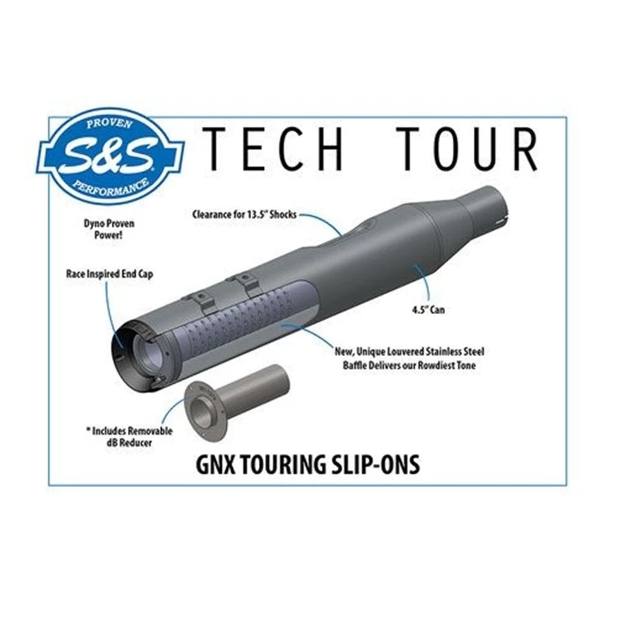 The M8 engine is a powerhouse, but a low idle combined with a plugged up exhaust conspire to mute the true sounds of freedom that this machine was designed to emit. Not to worry, S&S have created the GNX slip-ons with one thing in mind and that’s belting out the flag waving, eagle flying song of the American v-twin. Combining a 4.5″ shell with a tuned baffle and race inspired tip, the GNX lets the sound and power flow out of the M8. Wait, you only want one eagle and a few flags? Not a problem, they include a removable dB reducer that lets you tune the sound to suit your version of the American dream. Made in America, the GNX features the durable Guardian Black finish and is relieved for shocks up to 13.5″