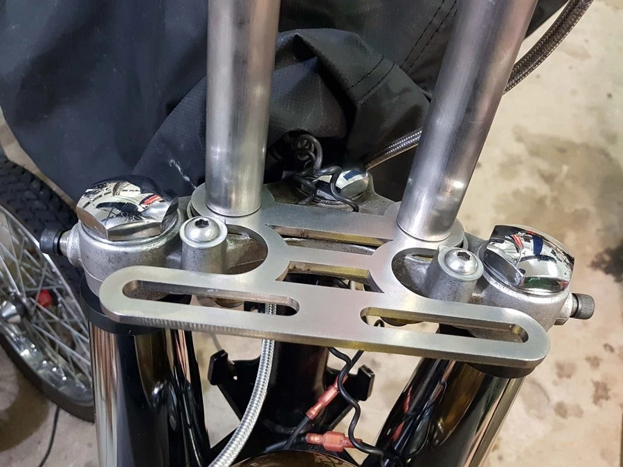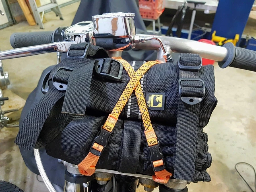 If you’re going far enough on your motorcycle, at some point you need to bring some stuff. Instead of buying a dresser, try a Pangor Cycles Kneiss Rack. This rack sandwiches nicely between your triple tree and your risers, and offers just enough room for some tools, tent, or a bedroll.