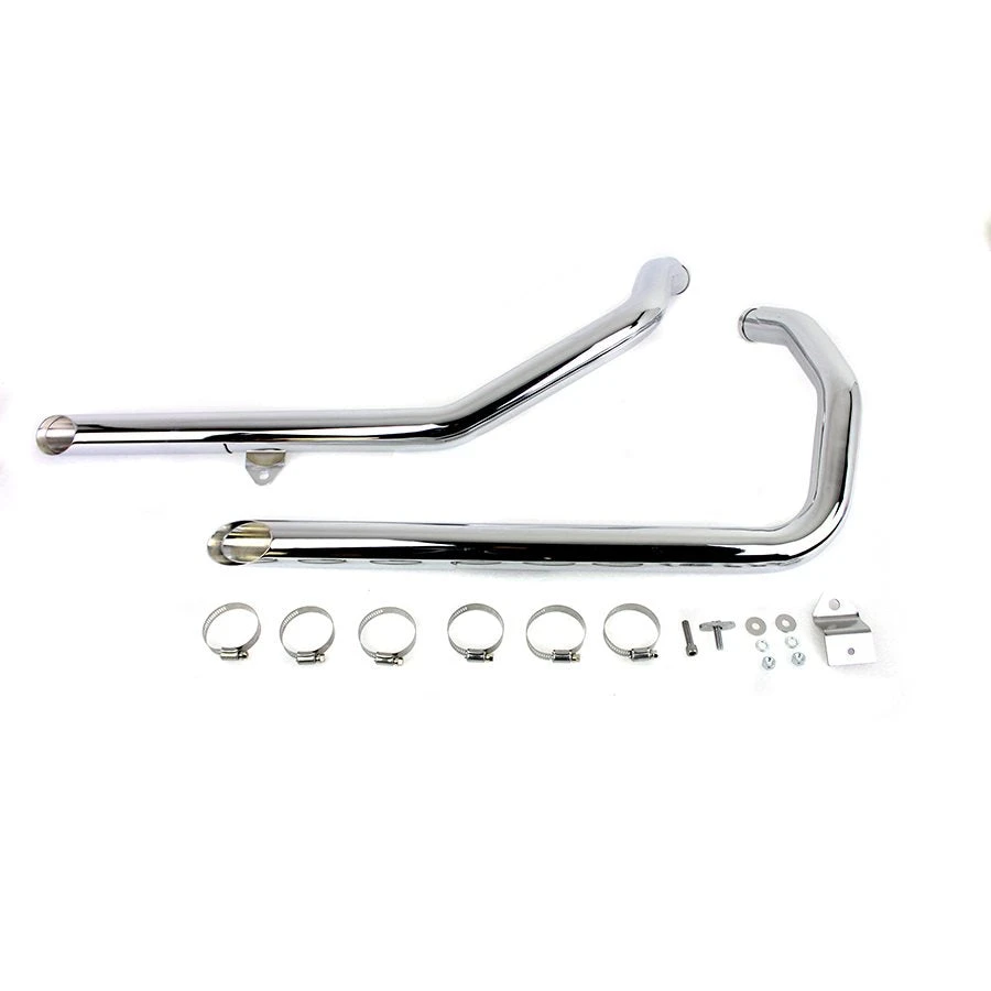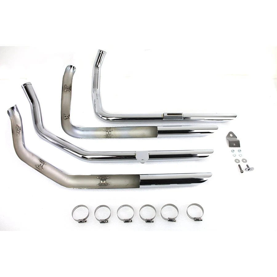 The heat shield runs from the exhaust port to the end of the pipe and has a slash cut built in. Form fitted heat shield is longer than inner pipe for a one piece seamless look. From the bend down the straight end measures 24-3/8″ on one pipe an dthe other is 18″. From the heat shield, on the bend, down the straight end is 25-3/8″ for the longer pipe and it is 20″ for the other pipe. *NOTE: Mounts to stock bracket. Will work with mid controls.