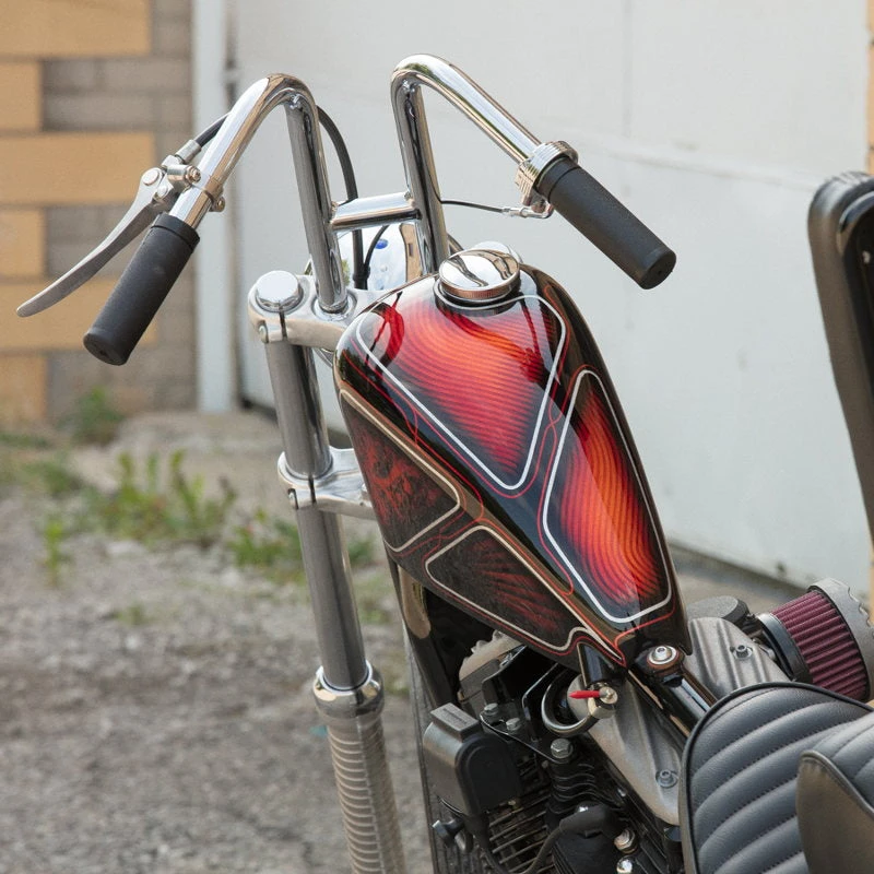 This Moto Iron tank is 100% brand-new construction and has the same shape as a narrowed OEM Harley Sportster tank. The cap bung is set up high, and accepts a standard OEM Harley-Davidson cam-lock style cap. The 1/4″ NPT petcock bung is on the left side of the tank (jiffy stand side) at the rear of the tank to assist in using the full fuel capacity of the tank..