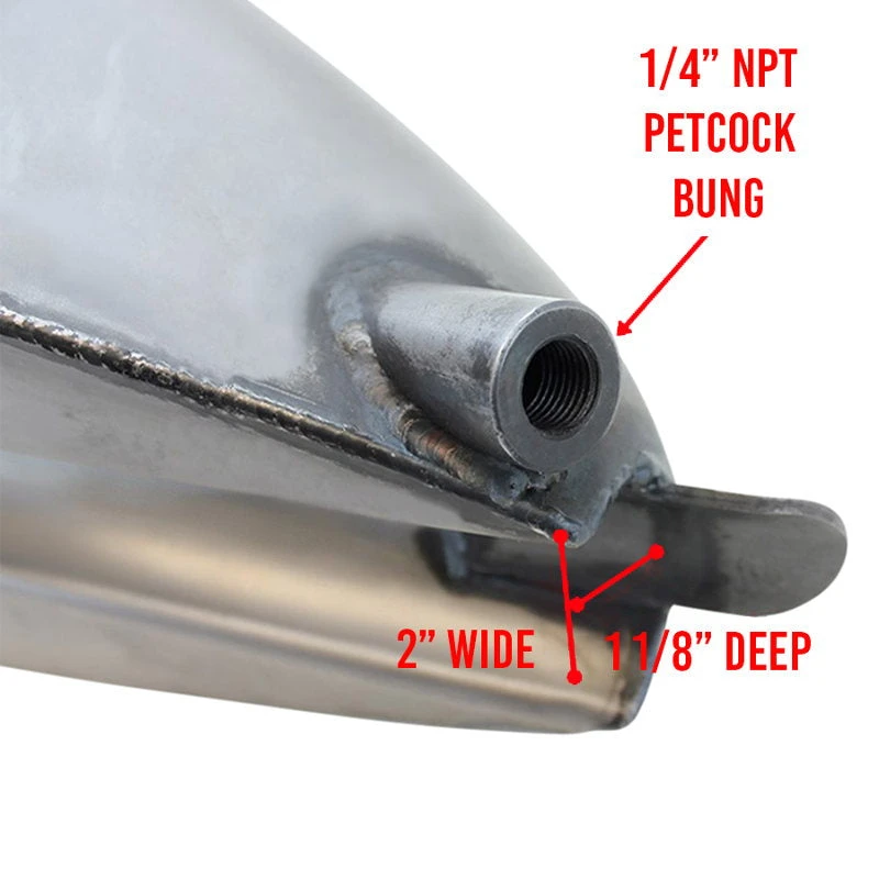 We offer a number of petcocks that fit this tank; P/N 105-0016 is a great, affordable option that’s easy on the wallet, and we also have fuel caps like P/N 105-0016 for a complete installation. This tank is TIG-welded pressure tested at the factory before shipping. Mounting tabs are welded onto the tank for convenience, but ultimately you need to fabricate a solid mount to your motorcycle. Some riders like to mount through the tabs directly into the frame. For a rock-solid and super-clean mount, we also offer a number of bungs. Please see image gallery for tank dimensions.