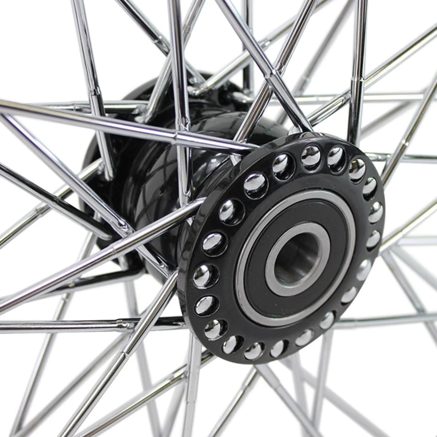 These 40-spoke, black wheels offer a smart, finished appearance for your chopper or custom. They have a particularly unique feature—the sealed spokes. Normally a tube-type tire needs to be used with a conventionally spoked wheel, but this Moto Iron wheel does not require a tube to be used, expanding your selection of compatible tires.