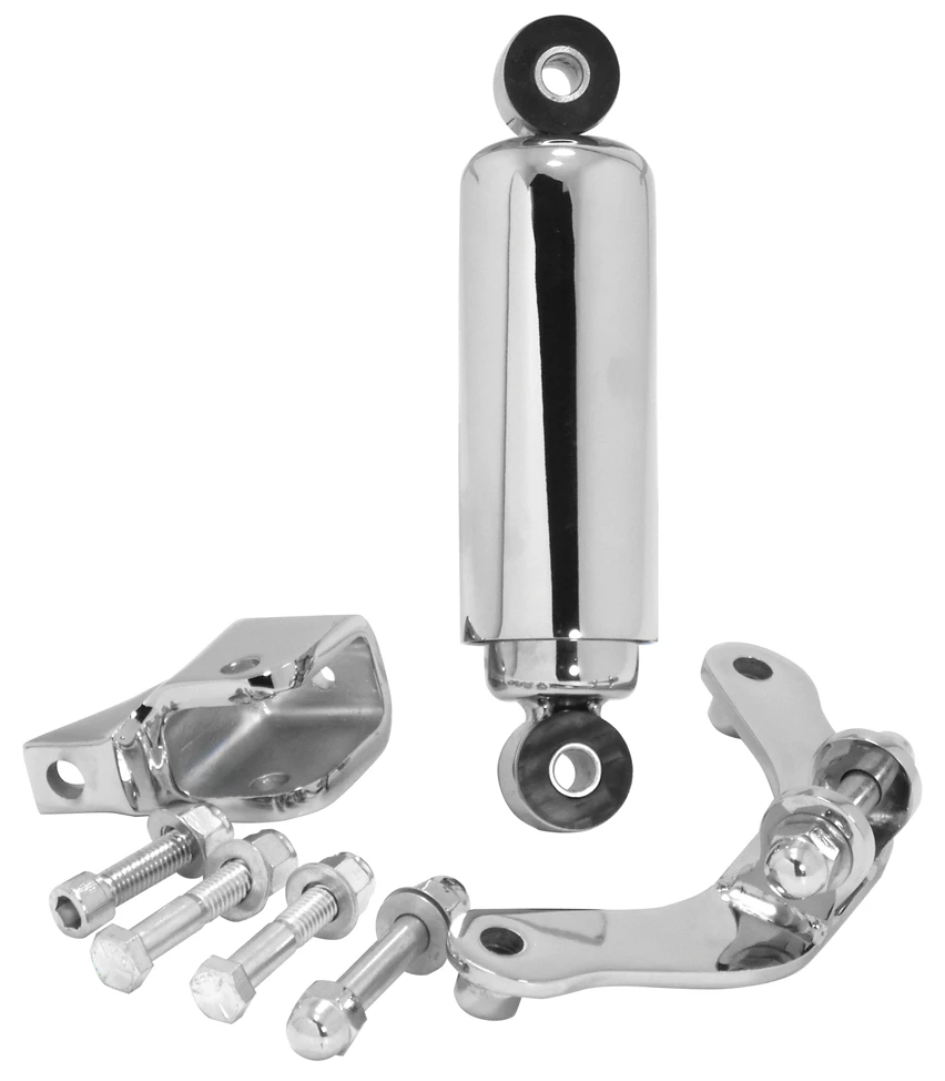Kit bolts on to Moto Ironâ„¢ VINTAGE STYLE ONLY and many other antique replica aftermarket brand Springers for increased ride control. Excellent upgrade for Springer front forks without built-in shock mounts. Helps control spring action for a much smoother ride. Includes mounting hardware. Works with springer part #’s 113-0123 113-0124 113-0125 113-0126 113-0127 113-0128
