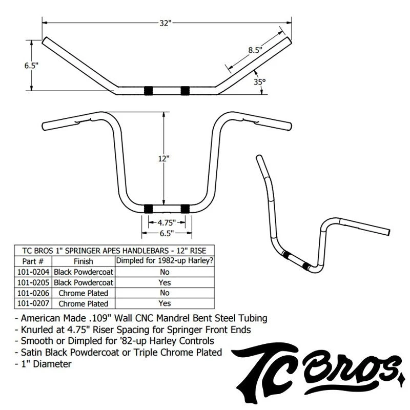 TC Bros. 1″ Springer Apes Handlebars – 12″ Chrome (Dimpled or Non-Dimpled)