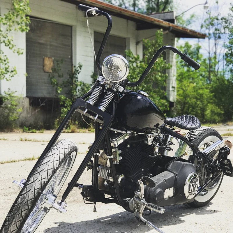Our 12″ Rise Springer Apes Handlebars are made from 1 inch OD x 0.109″ wall premium steel tubing. They are CNC mandrel bent for ultra-smooth bends and flawless symmetry. Knurled riser clamp locations are 4.75″ on centers to fit most aftermarket (Moto Iron, Paughco, DNA, Hardbody, etc) and stock Harley springer front ends. With 12″ of rise and sufficient pullback, these bars are very comfortable and fit stock cables, brake lines, and wiring on most Harley models.