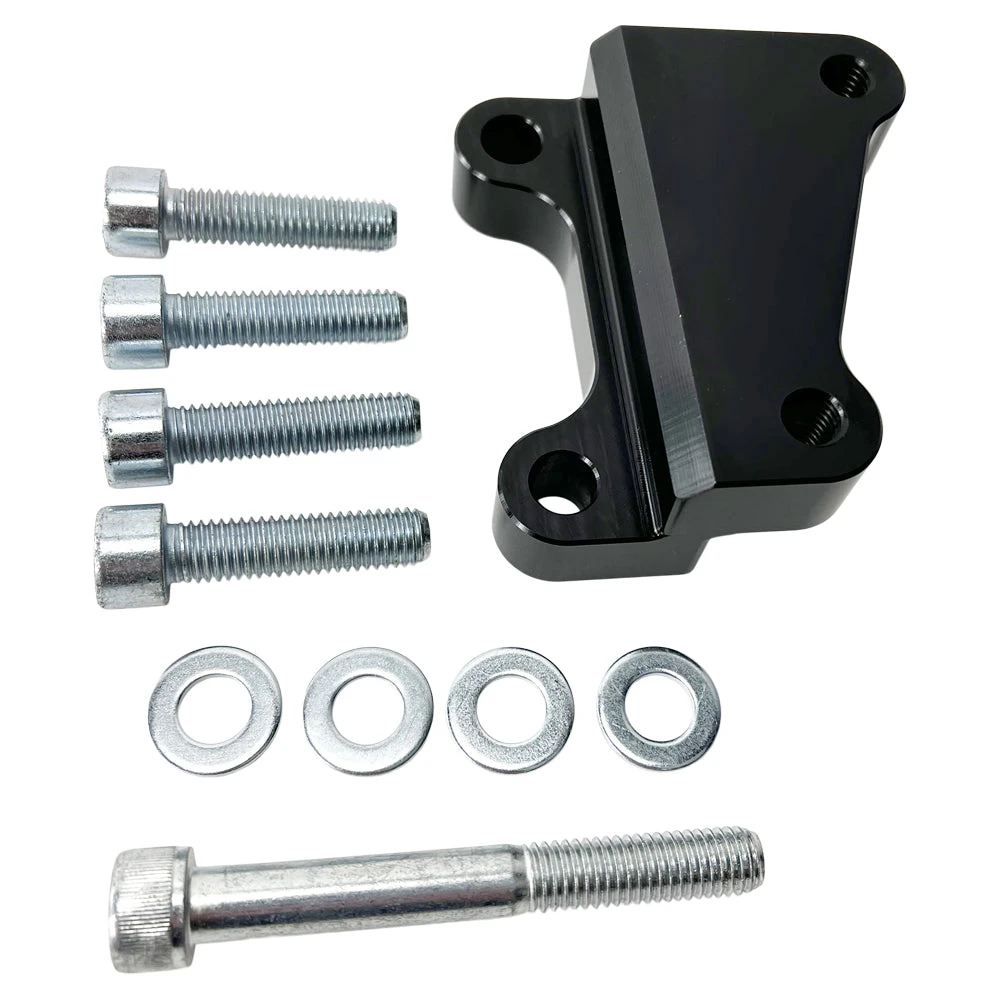 TC Bros. 12.6 inch black front brake bracket fits most 2008-up Harley OEM left side calipers. This bracket allows installation of oversized 12.6-inch diameter rotor for increased stopping power. Precision CNC machined right here in the USA from strong and lightweight 6061-T6 aircraft grade billet aluminum. Fits many Harley Davidson® Dyna, Softail, Sportster, and Touring models 2008 and newer except those listed as not compatible in the fitment guide.