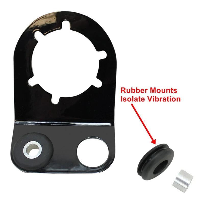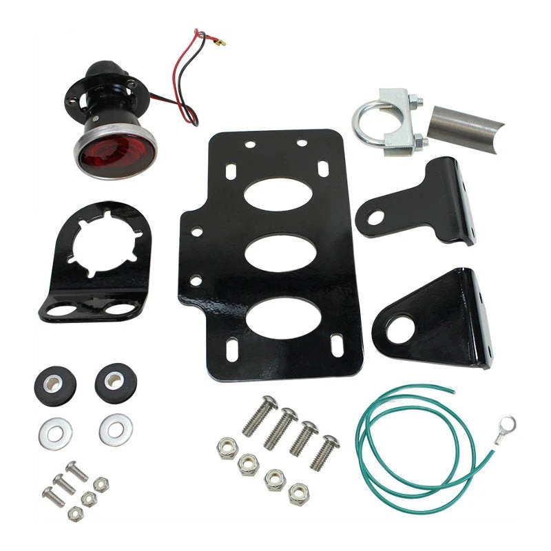 TC Bros. 2 Inch Round Bobber Side Mount License/Tail Light Bracket(tail light included). Our unique modular design allows the license plate to be mounted horizontally or vertically on either the left or right side of the bike by bolting it together using the pre cut mounting holes in the bracket. We also include two different mounting brackets so you can either bolt this bracket to your axle or weld the included raw steel slug anywhere on your frame and clamp it to that. The axle mount hole is .787″ diameter so this can be used on Harleys with 3/4″ axles and Metric bikes with 20mm axles. This is the most versatile bracket on the market! Your mounting options and license plate positions can be mixed and matched to give you the unique look that you are going for. Also included in the kit is the self grounding 12 Volt Brake/Tail Lamp/License Plate light with automotive style bulbs. The bracket is powdercoated gloss black and comes with stainless steel button head bolts/nuts. ALL STEEL BRACKETS ARE MADE IN USA!