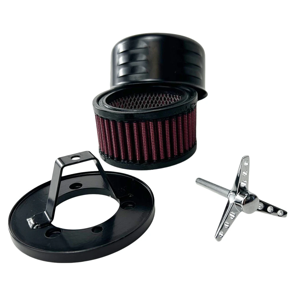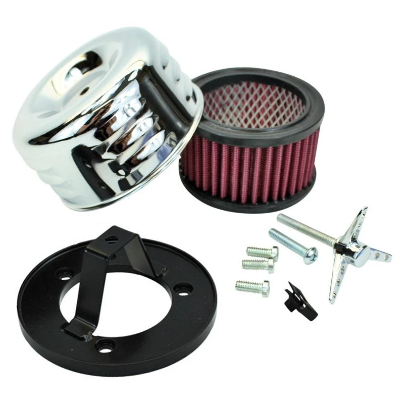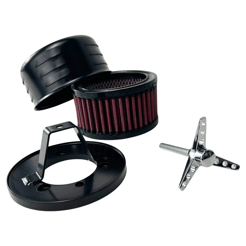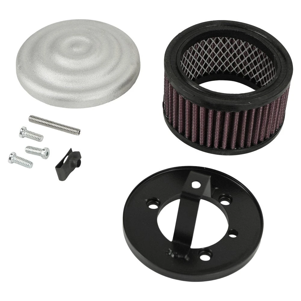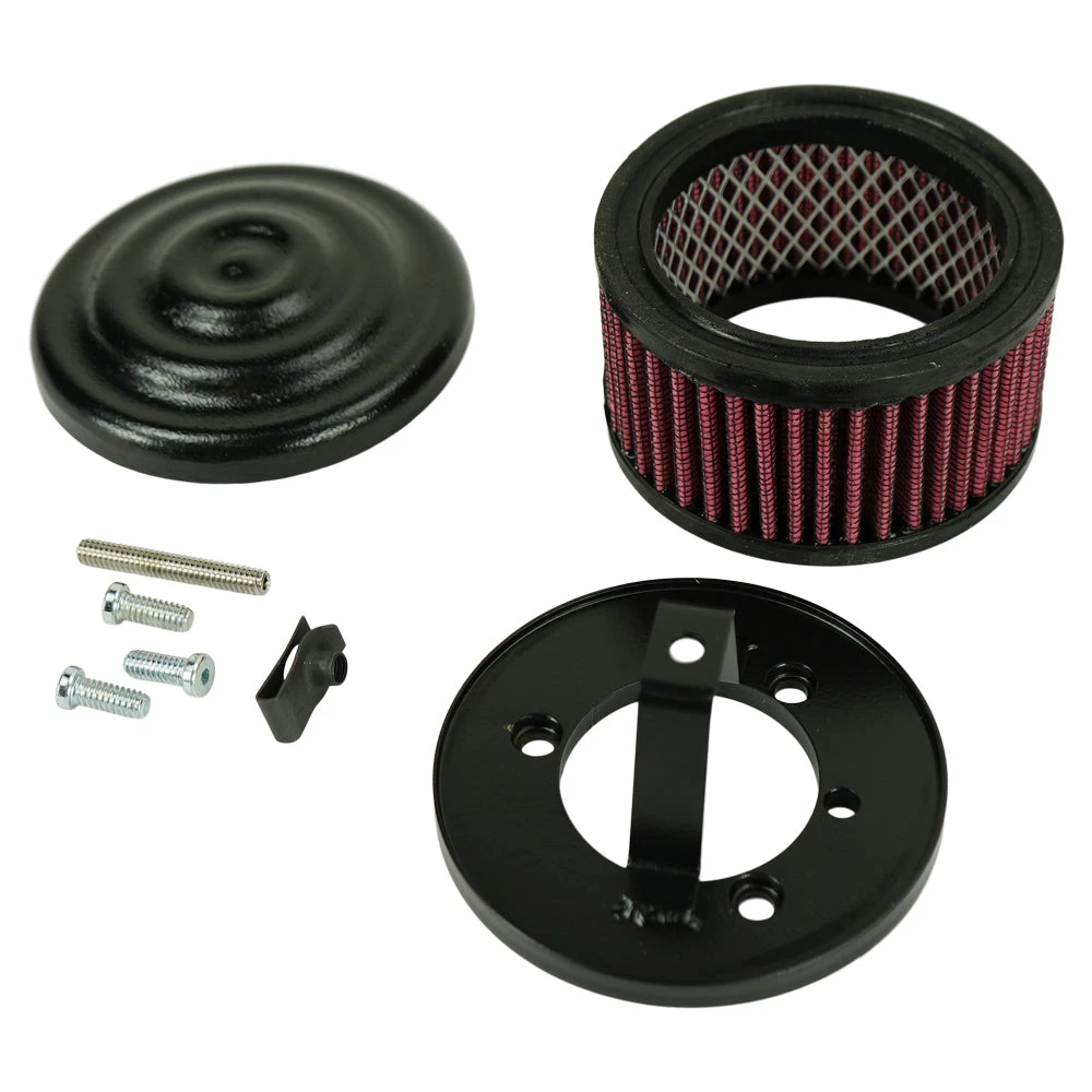 Our washable, reusable cotton gauze filter element provides high performance air flow to your V-twin, and since you stop buying paper filters, it’s economical. Kit attaches easily to your motorcycle using our American made, CNC-machined, powder coated steel mounting bracket. This ultra-compact kit is designed to fit all Harley-Davidson Big Twin and Sportster models using factory Tillotson, Bendix-Zenith and Keihin butterfly-style carbs.