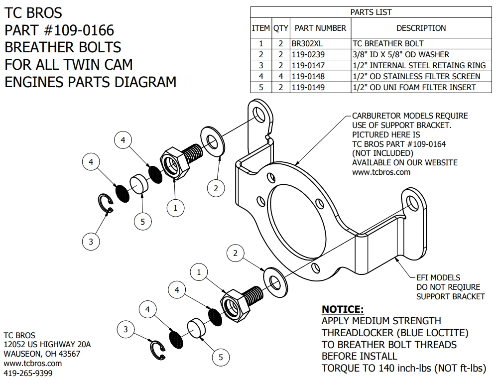TC Bros. Breather Bolts For your 1999-2017 Twin Cam Harley Motors (does not fit Sportster models). These bolts are the cleanest way to solve your crankcase venting issues when installing aftermarket air cleaners on your Harley.