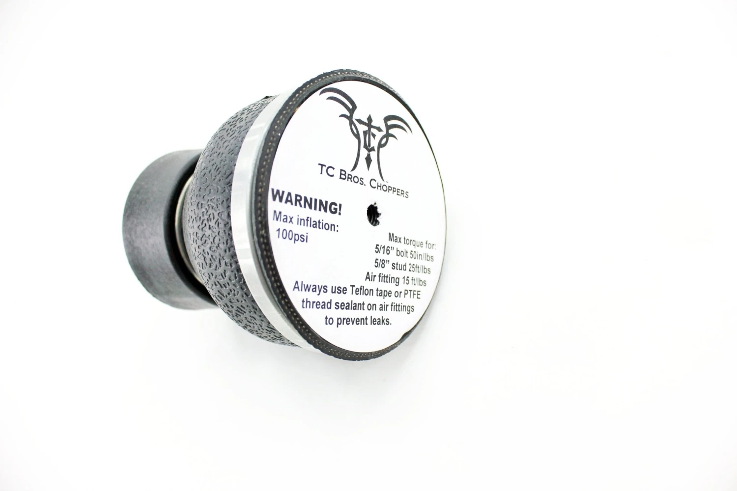 TC Bros. Choppers Universal Compact Rubber Air Spring. This air spring offers far superior vibration dampening as compared to traditional seat springs or shocks with virtually unlimited adjustability. The air spring features a 1/8″ NPT air port for unlimited plumbing possibilities. Most people use a threaded bicycle style schrader fill valve that allows the rider to easily inflate the air spring from 1psi-100psi depending on rider weight and desired firmness. Most riders prefer a 5psi-15psi operating pressure for maximum comfort. The Air Powered Spring gives you a 2.1″ length of travel that is very comparable to a set of 3″ seat springs but with better vibration dampening due to the fact that there is no “metal on metal” contact at the rear of the seat to transfer vibration to the rider. This air spring is a replacement part for TC Bros. Air Ride Solo Seat Bracket Kits (SKU #106-0005 and #106-0022) These air springs are universal and can be used on just about anything. Mount them on your mower, tractor, mini bike, go cart or anything you can think of! Max air pressure: 75psi Max static weight capacity: 400lbs
