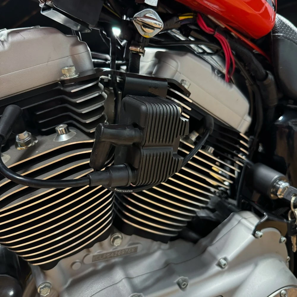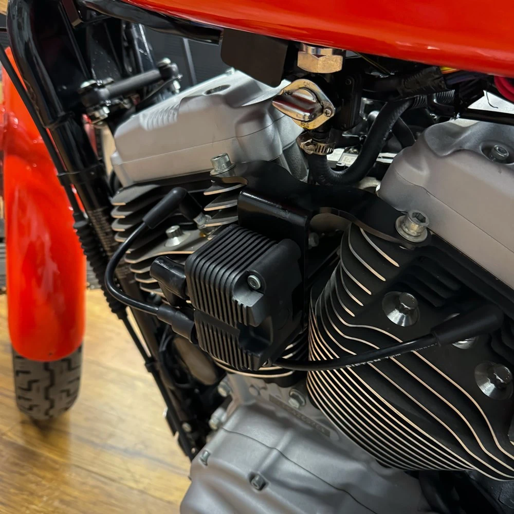 TC Bros. coil relocation brackets work great on custom 2004-2006 Sportsters. They enable you to relocate your ignition coil to the side of your bike which cleans up the area under your gas tank. They are constructed from thick American made steel and powdercoated for a durable finish.
