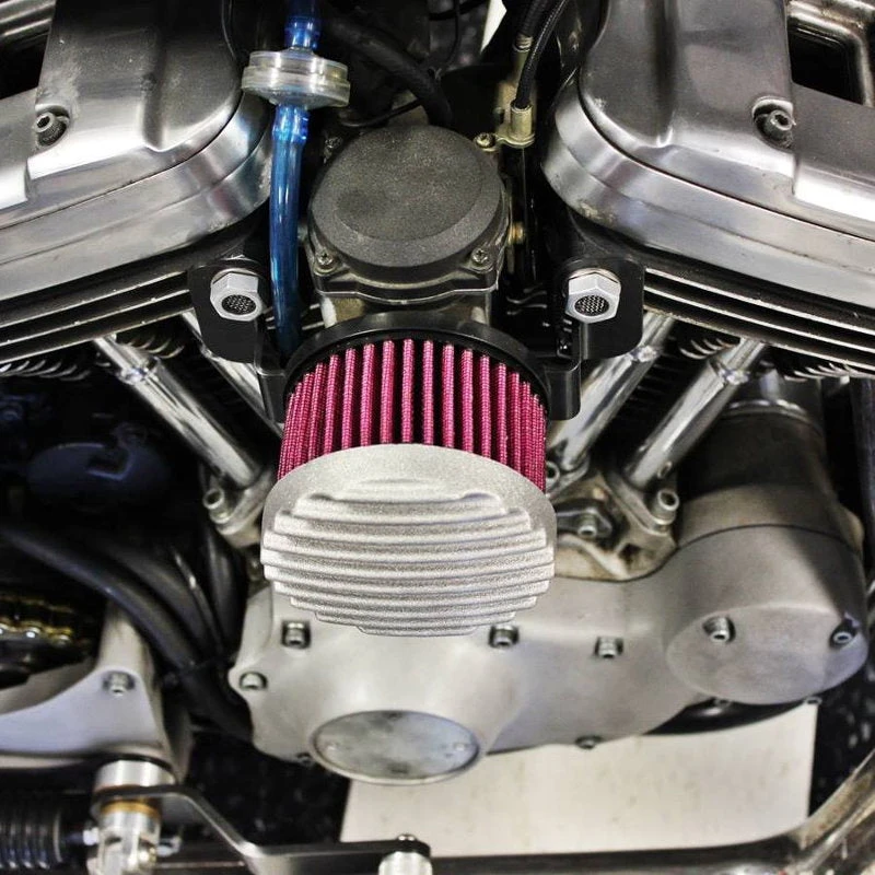 Add classic vintage style to your motorcycle with this Finned air cleaner in raw cast finish. The cover is beautifully hand cast from 356-T6 aluminum right here in the USA. Washable cotton gauze filter element provides high performance air flow to your V-Twin. Kit attaches easily using the American made, CNC machined, powder coated steel mounting bracket.Â