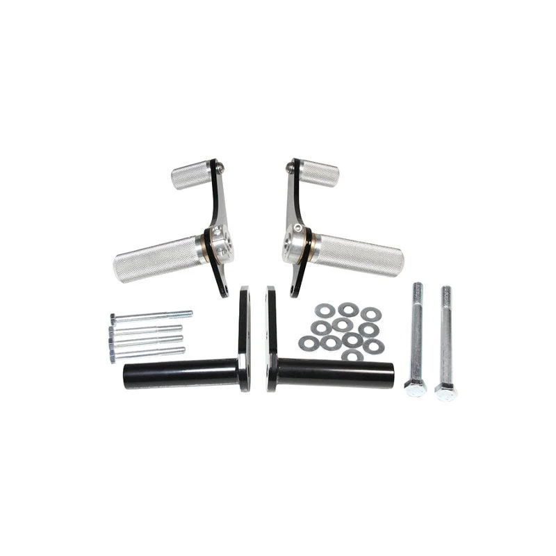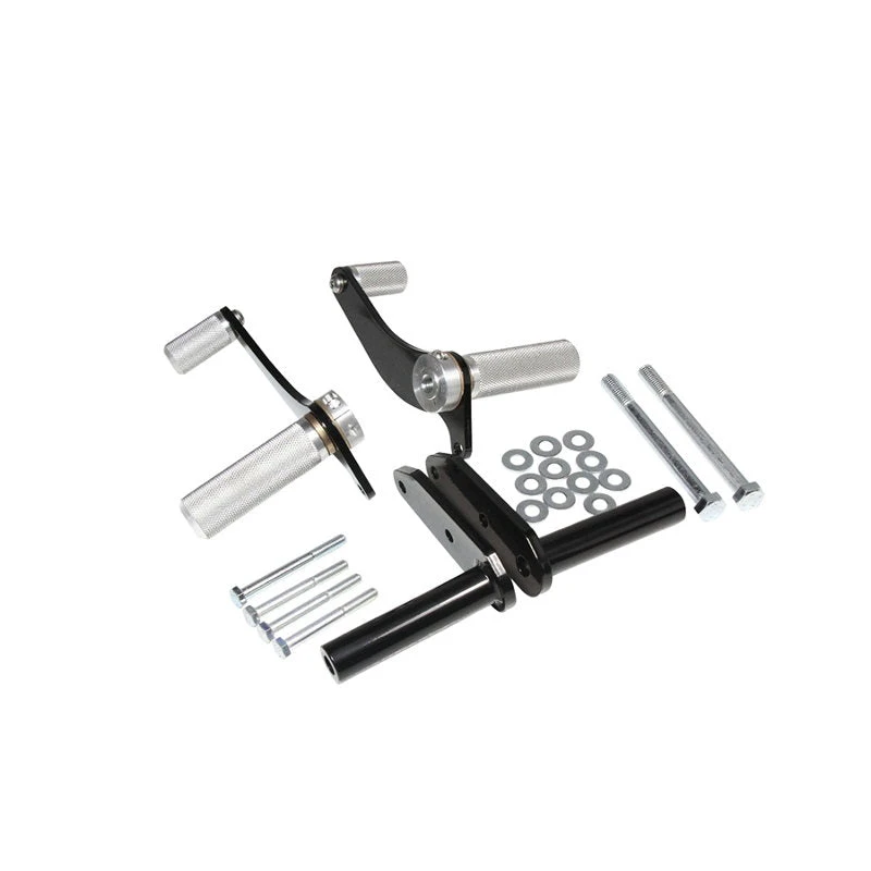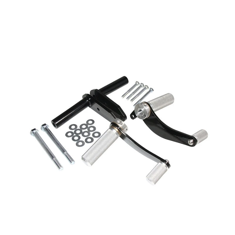 Our kit includes a pair of forward controls featuring CNC machined 6061 aluminum pegs. The mounting plates are heavy duty powder coated steel and bolt to your front motor mounts. The spacers are TIG welded to the mounting plates. Everything bolts on using the supplied mounting hardware and with no frame modifications. Mounting instructions with pictures are included with every kit.