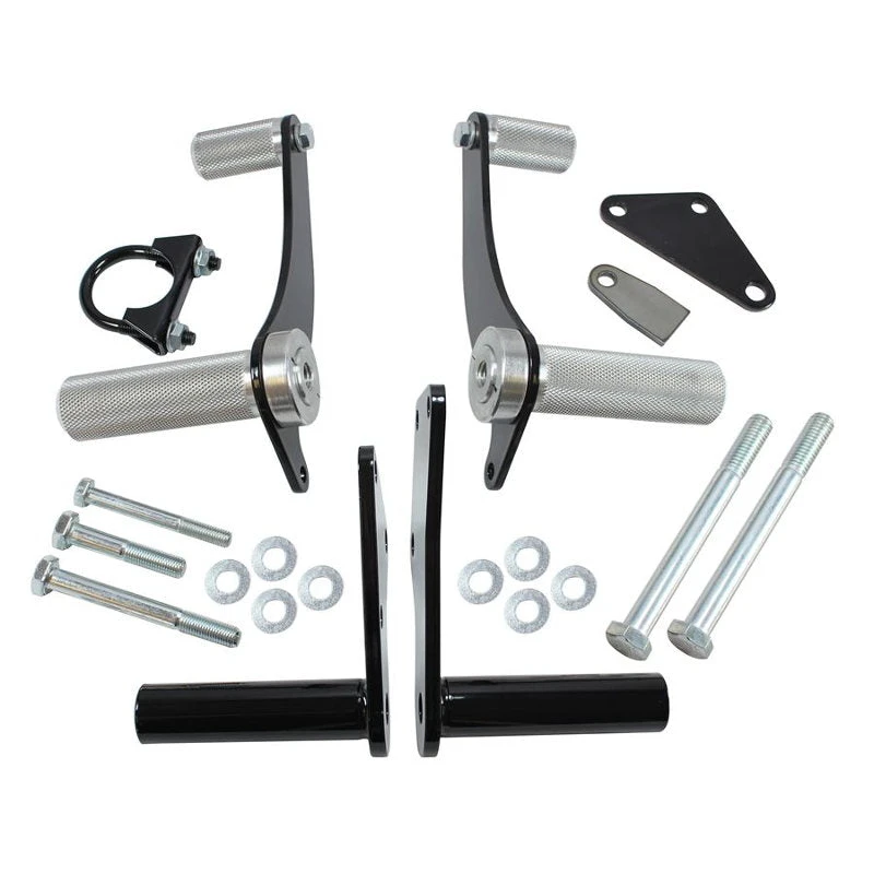 Kit includes a pair of forward controls featuring CNC machined, knurled aluminum pegs. The mounting plates are heavy duty powder coated steel and bolt on in place of your front motor mount on one side and u-bolt to your frame on the other side. The spacers are TIG welded to the mounting plates. Everything bolts on using your stock mounting hardware and with no frame modifications. The only welding required is a tab that is welded to your stock brake pedal in order to attach the linkage rods. It is easily done and mounting instructions with pictures are included with each kit.