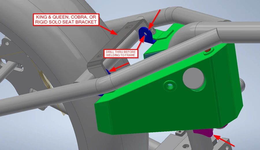 Included mounting kit works in conjunction with TC Bros. seat mounting kits #106-0079 or #106-0080 allowing for easy installation and seat hardware access. If using with a different seat (sprung solo, etc.) additional mounting tabs/hardware may be required.