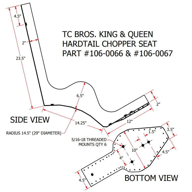 TC Bros. King & Queen hardtail chopper seats feature quality construction and timeless looks. Handmade from the finest materials, these seats are designed to be a perfect fit to our 1982-2003 or 2004-2013 Sportster weld-on hardtails using our mounting kit, fender, and sissy bar (sold separately).