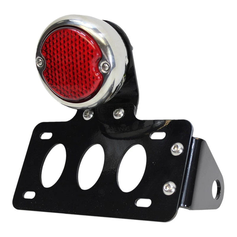 TC Bros. Side Mount License Plate/Tail Light Bracket (LED tail light included). Our unique modular design allows the license plate to be mounted horizontally or vertically on either the left or right side of the bike by bolting it together using the pre cut mounting holes in the bracket. We also include two different mounting brackets so you can either bolt this bracket to your axle or weld the included raw steel slug anywhere on your frame and clamp it to that. The axle mount hole is .787″ diameter so this can be used on Harleys with 3/4″ axles and Metric bikes with 20mm axles. This is the most versatile bracket on the market! Your mounting options and licence plate positions can be mixed and matched to give you the unique look that you are going for. Also included in the kit is the 12 Volt LED 33 Ford Replica Brake/Tail Lamp. The light features both a brake/running light as well as a License plate light to illuminate your plate at night. The two wire hook-up for the brake and tail lights mean this light is self grounding. The bracket is powdercoated gloss black and comes with stainless steel button head bolts/nuts ALL STEEL BRACKETS MADE IN USA!