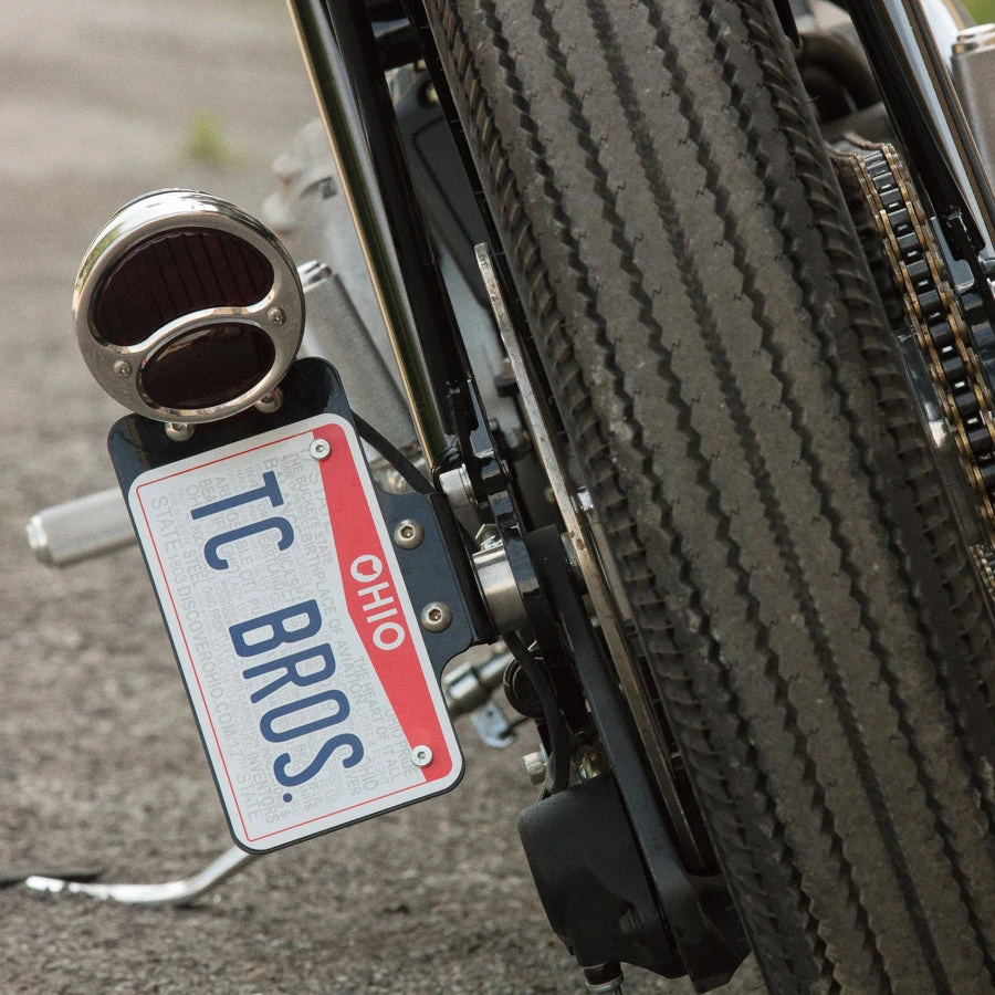 TC Bros. Side Mount License Plate/Tail Light Bracket (tail light included). Our unique modular design allows the license plate to be mounted horizontally or vertically on either the left or right side of the bike by bolting it together using the pre cut mounting holes in the bracket. We also include two different mounting brackets so you can either bolt this bracket to your axle or weld the included raw steel slug anywhere on your frame and clamp it to that. The axle mount hole is .787″ diameter so this can be used on Harleys with 3/4″ axles and Metric bikes with 20mm axles. This is the most versatile bracket on the market! Your mounting options and license plate positions can be mixed and matched to give you the unique look that you are going for. Also included in the kit is the 12 Volt Brake/Tail Lamp with automotive style bulbs. The light features both a brake/running light as well as a License plate light to illuminate your plate at night. The two wire hook-up for the brake and tail lights mean this light is self grounding.The bracket is powdercoated gloss black and comes with stainless steel button head bolts/nuts. ALL STEEL BRACKETS MADE IN USA!