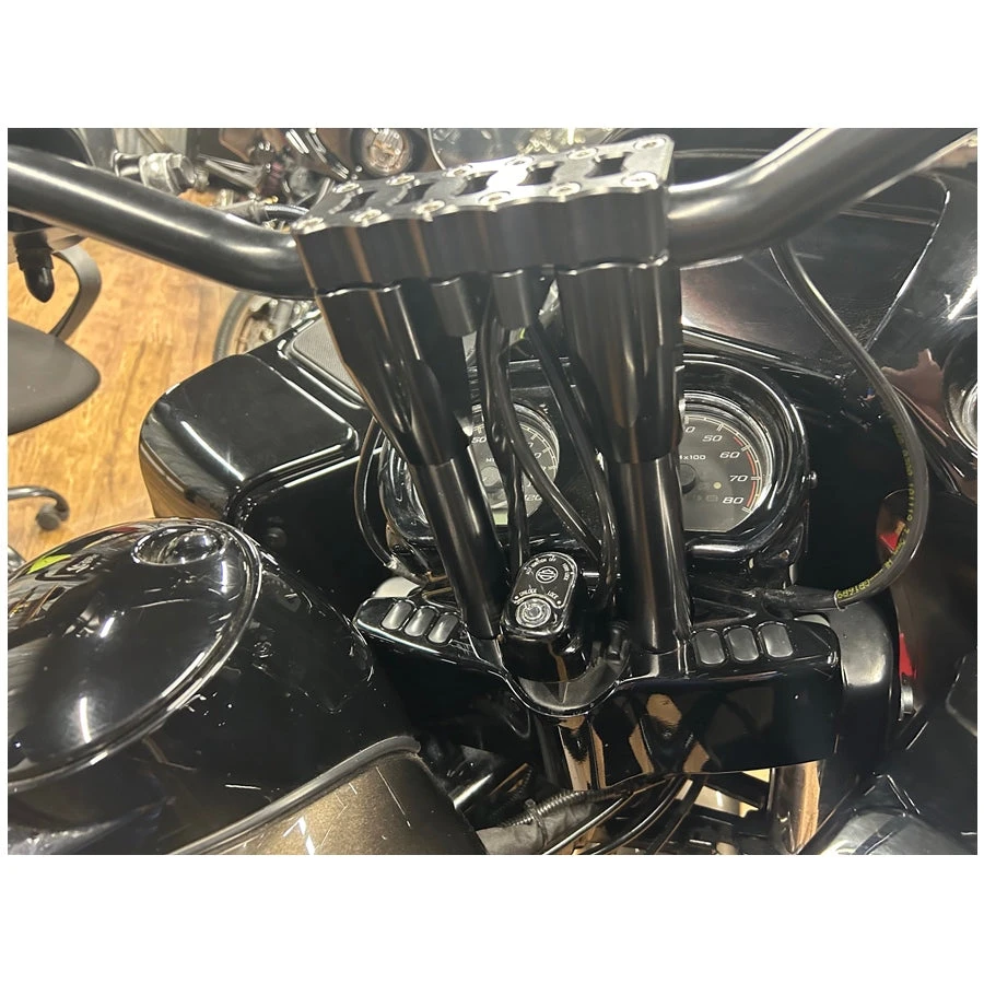 Note: Requires modification of factory plastic gauge housing nacelle.  Template for modification included with riser adapter. Most aftermarket handlebars are not compatible with OEM perch clamps and require purchase of TC Bros. clutch and brake perch clamps (click here to view) to allow mounting of OEM switch housings to aftermarket handlebars.  Fork lock will not be functional on stock ignition switch, but accessory features and ignition will still work properly.  For non-CVO models you may be able to have your dealer map your stock key switch to function as a CVO and allow use of the accessory switch from the handlebar controls.Â