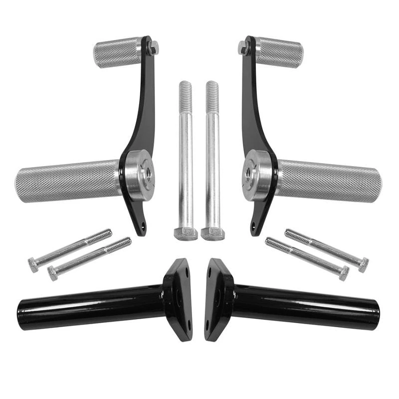 Includes a pair of forward controls featuring CNC machined aluminum pegs. The mounting plates are heavy duty powder coated steel and bolt right  to your front motor mounts. The spacers are TIG welded to the mounting plates. Everything bolts on with no frame modifications. Longer motor mount bolts are included in the kit. Mounting instructions with pictures are included.