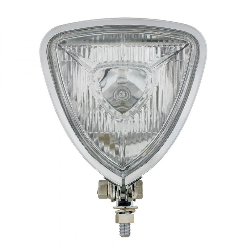 Triangle Headlamp. Includes lower mount and 12V 35W Halogen bulb (single filament). Aris Style. This device operates with a single-wire 12 Volt positive connection, while the ground is established through the mounting hardware.