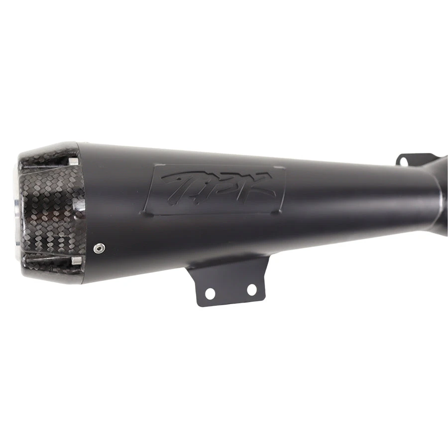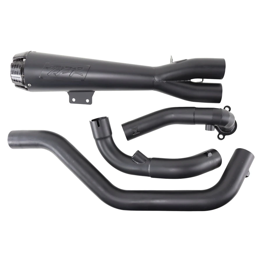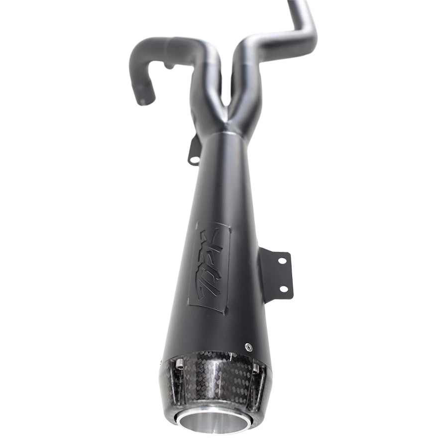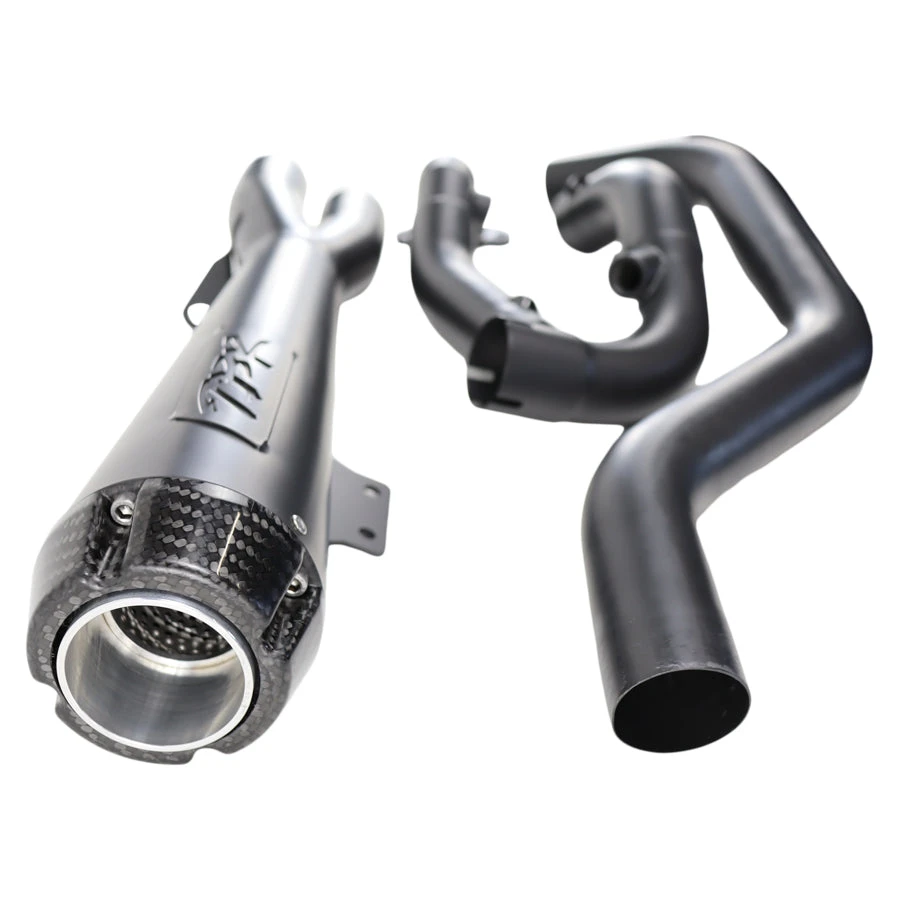 Itching to give your Revolution Max engine a little…more? Engineered to exacting standards, the Comp S exhaust system delivers unparalleled sound and performance and makes more power and meaty torque across a wide swath of the rev range. Each system is made with high-quality materials and is TIG-welded by hand. Made of mandrel-bent stainless tubing, the system features several diameter steps to promote velocity. Some exhausts make your bike go faster. This one will make your bike stop faster and handle better—one of the benefits of the Comp S exhaust is the massive weight savings over stock. Finish is matte black ceramic coating and the system is finished off with a reverse-taper carbon fiber end cap. Two Brothers crafts these exhaust systems in Riverside, CA.Â