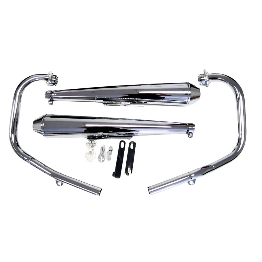 This street exhaust system is a complete replica of the beloved Norton Commando system, made specifically for the XS650 Standard. The single thick-wall headpipes are matched perfectly with mufflers that are fitted with the OEM-type internals for that sweet, unrivaled sound. And the chrome finish? It really pops! The all-inclusive kit supplies you with a pair of finned exhaust flanges, gaskets, and complete mounting bracket and hardware to get the job done quickly and completely.